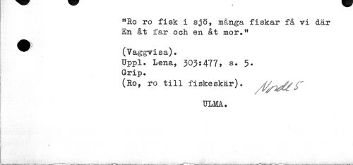//// "Ro ro fisk i sjö, mänga fiskar få vi där En åt far och en åt mor." //// ^^ (Vaggvisa). //// Uppl. Lena, 303:477, s. 5-Grip. //// (Ro, ro till fiskeskär). //// ULMA. ////