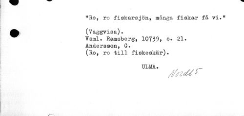 //// lfRo, ro fiskarsjön, mänga fiskar få vi.M //// A (Vaggvisa). //// . Vsml. Ramsberg, 10739, s. 21. //// Andersson, G. (Ro, ro till fiskeskär). //// ULMA. ////