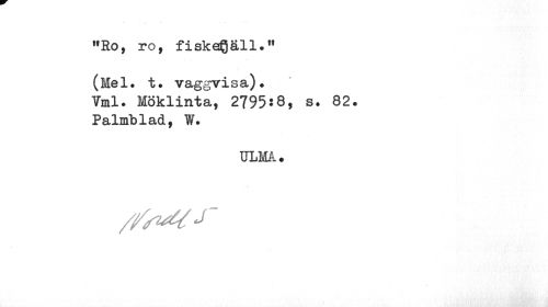 //// "Ro, ro, fiskeQäll." //// (Mel. t. vaggvisa). //// Vml. Möklinta, 2795:8, s. 82. //// Palmblad, W. //// ULMA. ////