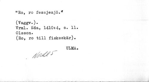 //// "Ro, ro fessjesjö.* (Vaggv.). //// Vrml. Ecla, 1410:4, s. 11. Olsson. //// (Ro, ro till fiskeskär). //// ULMÅ» //// ? ////