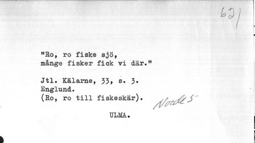 //// ¦V. '.-V ' V...',' m ' V f ^ .' '•.< ¦. •> ¦ : ••, f //// ¦ //// "Ro, ro fiske sjö, månge fisker fick vi där." //// ... ... . .j //// Jtl. Kälarne, 33, s. 3* Englund. //// (Ro, ro till fiskeskär). ^ //// ulma. j //// ¦ //// i //// i ¦ //// ! //// i ! ////