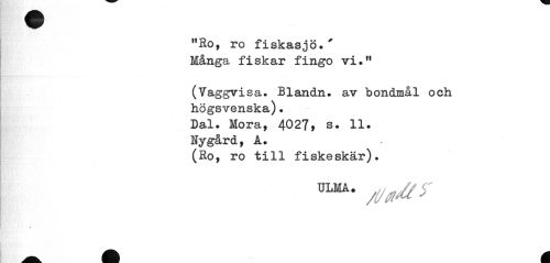 //// "Ro, ro fiskasjö.' Många fiskar fingo vi." //// (Vaggvisa. Blandn. av bondmål och högsvenska). //// Dal. Mora, 4027, s. 11. //// Nygård, A. //// (Ro, ro till fiskeskär). ////