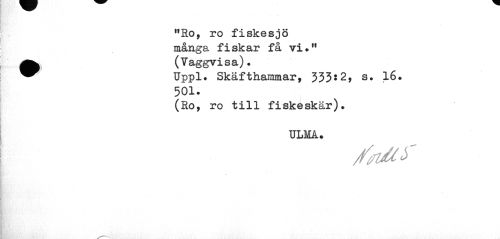 //// "Ho, ro fiskesjö många fiskar få vi." (Vaggvisa). //// ^^ Uppl. Skäfthammar, 333:2, s. 16. //// 501. //// (Ro, ro till fiskeskär). //// ULMA. //// /tuUf ////