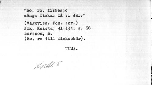 //// 11 Ro, ro, fiskesjö många fiskar få vi där.M //// r //// (Vaggvisa. Fon. skr.) Nrk. Knista, 41:134, s* 58. //// Larsson, R. ! //// (Ro, ro till fiskeskär). //// s i- //// ULMi. 1 //// é //// I i //// i //// m //// 5 //// i ////