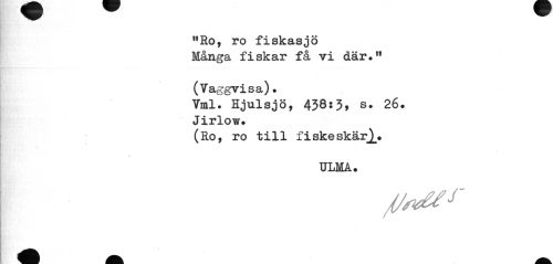 //// "Ro, ro fiskasjö Många fiskar få vi där." //// (Vaggvisa). //// Vml. Hjulsjö, 438:3, s. 26. Jirlow. //// (Ro, ro till fiskeskär^. //// ULMA. ////