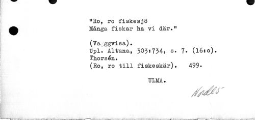 //// rlRo, ro fiskesjö ^^ Många fiskar ha vi där.11 //// (Vagggvisa). //// Upl. Altuna, 303;734, s. 7* (l6:o). //// Thorsén. //// (Ro, ro till fiskeskär). 499* //// ULMA. ////