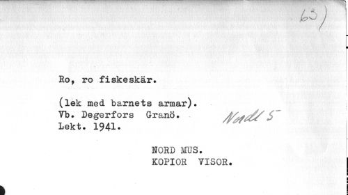 //// ut J //// ¦ //// Ro, ro fiskeskär. //// (lek med barnets armar). //// Vb. Degerfors Granö. S~ //// Lekt. 1941. //// NORD MUS. KOPIOR VISOR. //// k i ////