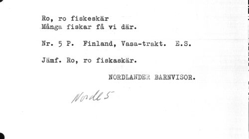 //// ¦ I //// Ro, ro fiskeskär i //// Många fiskar få vi där. | //// l //// j 1 //// Nr. 5 P* Finland, Vasa-trakt. E.S. j //// i //// Jämf. Ro, ro fiskaskär. j //// i //// NORDLANDER BARNVISOR. //// i //// i //// i ////