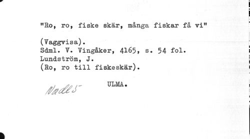 //// ¦ //// i //// ... i "So, ro, fiske skär, många fiskar få vi" //// (Vaggvisa). ; //// Sdml. V. Vingåker, 4165, s. 54 fol. j //// Lundström, J. \ //// (So, ro till fiskeskär). ¦ //// i //// , ^ ,^ ULMA. i //// ¦ //// i //// G //// I ////