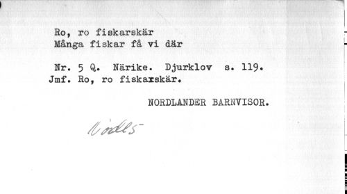 //// Ro, ro fiskarskär Många fiskar få vi där //// Nr. 5 Q. Närike. Djurklov s. 119? Jmf. Ro, ro fiskarskär? //// NORDLANDER BARNVISOR. //// i //// i //// B ////