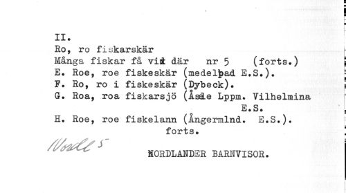 //// I //// E //// i //// II. //// Ro, ro fiskarskär //// Många fiskar få vi± där nr 5 (forts.) I //// E. Roe, roe fiskeskär (medel|>ad E.S.). j //// F. Ro, ro i fiskeskär (Dybeck). i G» Roa, roa fiskarsjö (Åsi e Lppm. Vilhelmina f //// E. S. s //// H. Roe, roe fiskelann (Angermlnd. E.S.). //// forts. [ //// NORDLANDER BARNVISOR. ////
