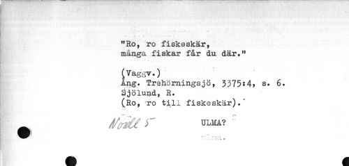 //// * - ... ._.' . _ . ' -i //// "Ro, ro fiskeskär, många fiskar får du där." //// v //// (Vaggv.) //// Ang. Trehörningsjö, 3375:4, s. 6. Sjölund, R. //// (Ro, ro till fiskeskär)." //// o //// • r ULMA? G //// / //// •K ' -:-• >s , -v //// •... - •.. I <e Ö' ////