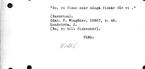 //// m mL //// ^^ 11 Ro, ro fiske skär många fiskar får vi .11 //// (Barnvisa)• //// Sdml. V. Vingåker, 10867, s. 48. //// Lundström, J. //// (Ro, ro till fiskeskär). //// ULMA. ////