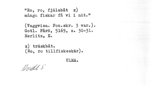 //// ,fRo, ro, fjälabåt x) många fiskar få vi i nät." //// (Vaggvisa. Fon.skr. 3 var.). Gotl. FårÖ, 5169, s. 30-31-Herlitz, E. //// x) träskbåt. //// (Ro, ro tillfiskeskär). //// ULMA. ////