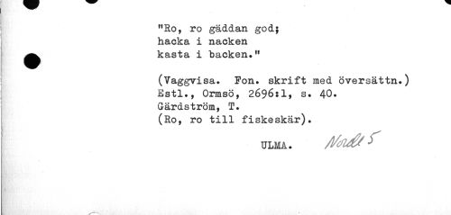 //// "Ro, ro gäddan god; hacka i nacken ^^ kasta i backen." //// (Vaggvisa. Pon. skrift med översättn.) //// Estl., Ormsö, 2696:1, s. 40. //// Gärdström, T. //// (Ro, ro till fiskeskär). //// ULMA. ////