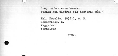 //// "Ro, ro herrarna kommer //// vagnen han dundrar och hästarna går.M //// Vml. Ervalla, 3076:1, s. J. //// Hammarbäck, H. //// Vaggvisa. //// Barnvisor //// ULMA. //// # ////