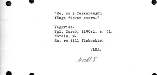 //// "Ro, ro i feskaresjön fånga fiskar stora." //// Vaggvisa. //// Vgl. Torsö, 1190:1, s. 31. Nordin, M. //// Ro, ro till fiskeskär. //// ULMA. //// j/wfry //// v ////