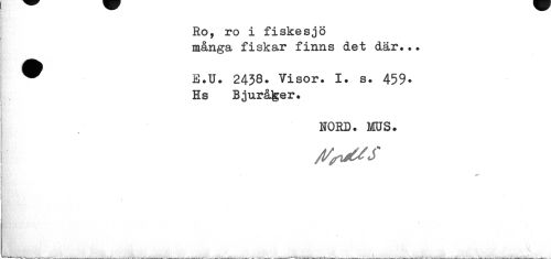 //// Ro, ro i fiskesjö //// många fiskar finns det där... //// ® E.U. 2438. Visor. I. s. 459* //// Hs Bjuråfeer. //// NORD. MOS. //// r //// /l/fi&S ////