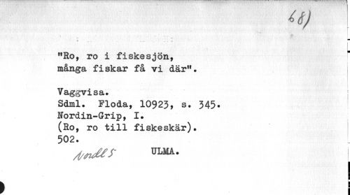 //// Q) //// •v ... . ---... . //// I //// "Ro, ro i fiskesjön, //// många fiskar få vi där". //// . //// * //// Vaggvisa. //// Sdml. Flöda, 10923, s. 345* Nordin-Grip, I. (Ro, ro till fiskeskär). 502. //// dvMS- ULMA. I //// ) ! ////