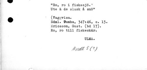 //// "Ro, ro i fiskesjö." Ute ä de slask å snö" //// •(Vaggvisa. //// Sdml. öfumba, 347:46, s. 13? //// Ericsson, Gust. (bd 17)* Ro, ro till fiskeskär. //// ULMA. //// /trtdt * (v ////