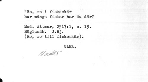 //// "Ro, ro i fiskeskär //// hur många fiskar har du där? //// Med. Attmar, 2517:1, s. 13. //// Höglundh. J.Hj. //// (Ro, ro till fiskeskär). //// ULMA. //// * //// k ////