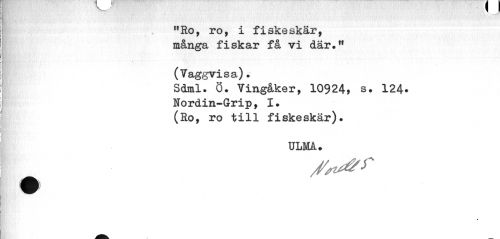 //// V //// "Ro, ro, i fiskeskär, många fiskar få vi där." //// (Vaggvisa). //// Sdml. Ö. Vingåker, 10924, s. 124» //// Nordin-Grip, I. //// (Ro, ro till fiskeskär). //// ULMA. ////