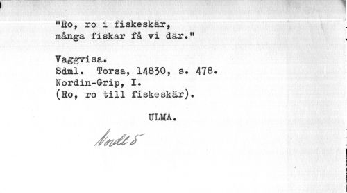 //// "jtto, ro i fiskeskär, många fiskar få vi där." //// i //// Vaggvisa. //// Sdml. Torsa, 14830, s. 478. //// Nordin-Grip, I. //// (Ro, ro till fiskeskär). //// ULMA. //// Xe^r j //// i I ////