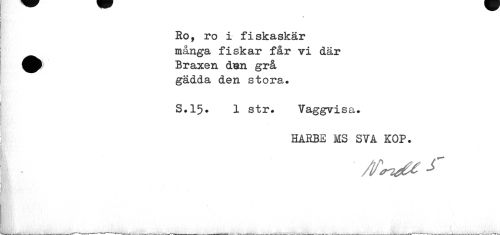 //// Ro, ro i fiskaskär många fiskar får vi där ^^ Braxen d^n grå //// gädda den stora. //// S.15» 1 str. Vaggvisa. //// HARBE MS SVA KOP. //// —___V -...---" -»L» V1- . „ - ---. ___—___..-t.^-W-V^v--.. -J--_ ,-. ...--- ... , --.w---..«•'--- ////