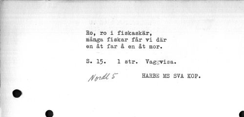 //// * //// ... //// Ho, ro i fiskaskär, många fiskar får vi där en åt far å en åt mor. //// S. 15• 1 str. Vaggvisa. rfpi/é HARBE MS SVA KOP. //// ¦ ¦ ////
