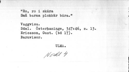 //// - //// ¦ //// "Ro, ro i skära //// Små barna plokkär bära." //// Vaggvisa. //// Sdml. Österhaninge, 347:46, s. 13* Ericsson, Gust. (bd 17)* //// Barnvisor. ; //// s ! r //// t • //// ULMÅ. //// yVjV&t //// i i //// i //// ; //// i ////