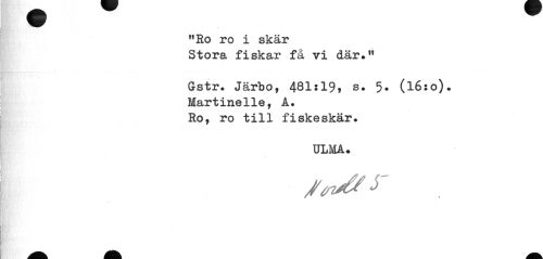 //// "Ro ro i skär //// Stora fiskar få vi där." //// Gstr. Järbo, 481:19, s. 5. (l6:o). //// Martinelle, A. //// Ro, ro till fiskeskär. //// ULMA. ////