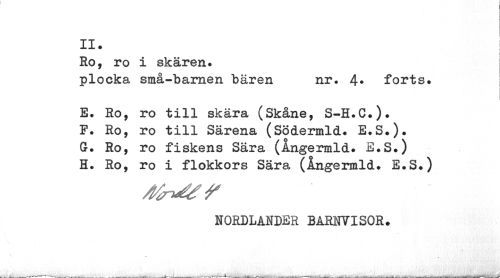 //// II. //// i //// Ro, ro i skären. j //// plocka små-barnen bären nr. 4* forts. //// E. Ro, ro till skära (Skåne, S-H.C.). //// F. Ro, ro till Särena (Södermld. E.S.). //// G. Ro, ro fiskens Sära (Angermld. E.S.) //// H. Ro, ro i flokkors Sära (Ångermld. E.S.) //// NORDLANDER BARNVISOR. ////