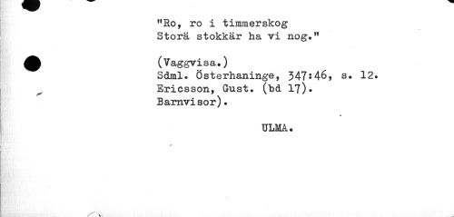 //// "Ro, ro i timmerskog Stora stokkär ha vi nog»" //// (Q (Vaggvisa.) //// Sdml. Österhaninge, 347:46, s. 12. ^ Ericsson, Gust. (bd 17). //// Barnvisor). //// ULMA. //// * ////