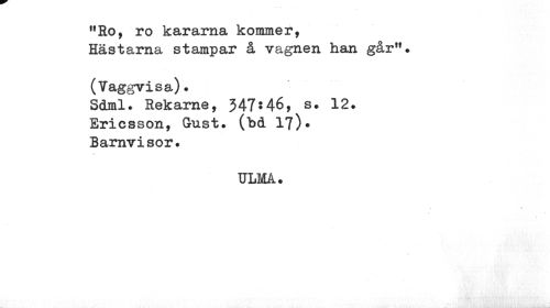 //// 11 Ro, ro kararna kommer, //// Hästarna stampar å vagnen han går"? //// (Vaggvisa). //// Sdml. Rekarne, 347:46, s. 12. Ericsson, Gust. ("bd 17). Barnvisor. //// ULMÅ. ////