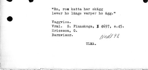 //// "Ro, ros katta har skägg lever ho länge värper ho ägg." //// ^^ Vaggvisa. //// Vrml. S. Finnskoga, J[ 4697» s.45« Ericsson, G. //// Barnvisor. tft/f M //// ULMA. ////