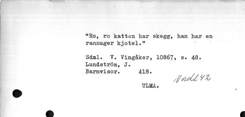 //// / //// f,Ro, ro katten har skegg, han har en rannuger kjotel." //// Sdml. V. Vingåker, 10867, s. 48. //// Lundström, J. Barnvisor. 418. //// zl/aM. 91 //// ULMA. ////