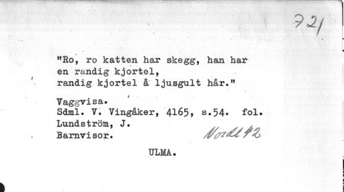 //// ¦ « . * ¦ I * • //// . . ' L //// t ' 4 //// "Ro, ro katten har skegg, han har //// * . * '. -' //// en randig kjortel, //// randig kjortel å ljusgult hår." //// Vaggvisa. //// Sdml. V. Vingåker, 4165» s.54* fol. Lundström, J. //// Barnvisor. fZ> //// t //// ULMÅ. //// i i ////