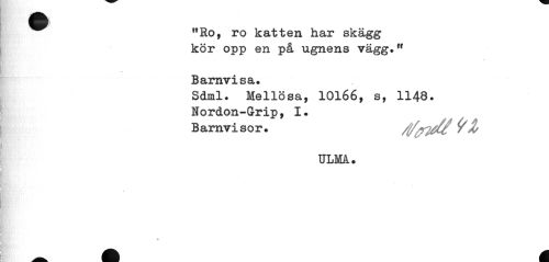 //// ¦ //// M ^ //// I, //// 11 Ho, ro katten har skägg kör opp en på ugnens vägg." //// Barnvisa. //// Sdml. Mellösa, 10166, s, 1148. Nordon-Grip, I. //// Barnvisor. ^^ //// ULMk, //// * //// ffiHri k'' 1 ////