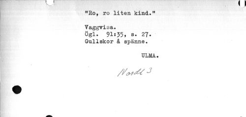 //// V - " //// ¦ //// MRo, ro liten kind." Vaggvisa. //// Ögl. 91:35, s. 27. //// Guliskor å spänne. //// ULMA. //// * ////