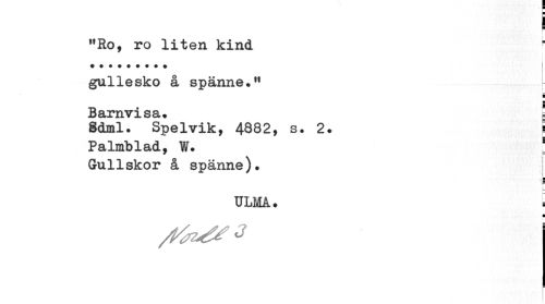 //// "Ro, ro liten kind gullesko å spänne." //// i //// Barnvisa. i //// Sdml. Spelvik, 4882, s. 2. ! //// Palmblad, W. ¦ //// Gullskor å spänne). //// ULMA. i //// ¦ ////