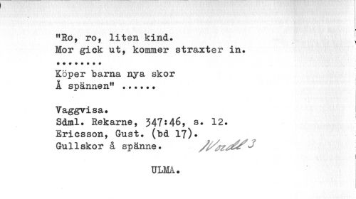 //// "Ro, ro, liten kind. [ //// Mor gick ut, kommer straxter in. //// Köper barna nya skor 1 spännen" ... //// Vaggvisa. //// Sdml. Rekarne, 347*46, s. 12. Ericsson. //// Gust. (bd 17). Gullskor å spänne. /^tfzt& ^ //// ULMÅ. ////