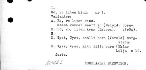 //// I. //// Ro, ro liten kind. nr 3* _ Varianter: //// ^P A. Ro, ro liten kind. //// mamma kommer snart in (Dalsid. Borg- //// B. Ro, ro, liten kyng (Dybeck). ström). K. //// C. Tyst, Tyst, snällt barn (Vermld) Borg- //// ström. //// D. Vyss, vyss, mitt lilla barn (Skåne //// Lilja s 12. //// forts. //// /j/fl&Z j NORDLANDER BARNVISOR. ////