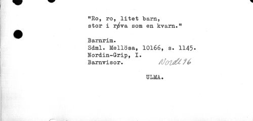 //// "Ro, ro, litet barn, stor i r/va som en kvarn." //// Barnrim. //// Sdml. Mellösa, 10166, s. 1145- //// Nordin-Grip, I. Barnvisor. //// ULMA. ////