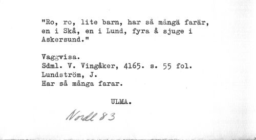 //// "Ro, ro, lite barn, har så mänga farär, en i Skå, en i Lund, fyra å sjuge i Askersund." //// Vaggvisa. //// Sdml. V. Vingåker, 4165- s. 55 fol. //// Lundström, J. //// Har så många farar. //// ULMA. ////