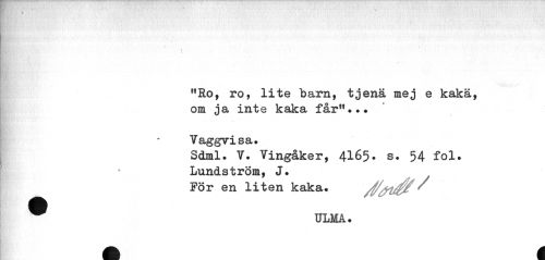 //// "Ro, ro, lite barn, tjenä mej e kaka, om ja inte kaka får"... //// Vaggvisa. //// Sdml. V. Vingåker, 4165. s. 54 fol. Lundström, J. //// För en liten kaka. /f^tft^ ^ ULMA. ////