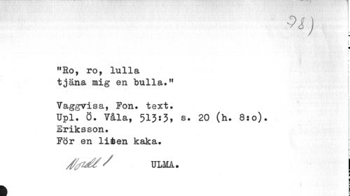 //// 4>Jj I //// : i //// i ¦ //// •'• • • '. " • , '. . . ' v ... //// S //// 5 //// "Ro, ro, lulla //// tjäna mig en bulla." I //// i //// i //// Vaggvisa, Fon. text. //// Upl. Ö. Våla, 513:3, s. 20 (h. 8:o). //// Eriksson. //// För en liéen kaka. //// ULMA. //// i //// F //// k ////