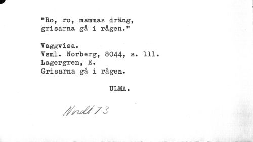 //// I //// HRo, ro, mammas dräng, grisarna gå i rågen." //// Vaggvisa. //// Vsml. Norberg, 8044, s. 111. Lagergren, E. Grisarna gå i rågen. //// ULMA. ////