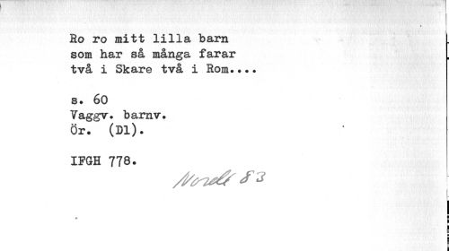 //// Ro ro mitt lilla barn som har så många farar två i Skare två i Rom... //// s. 60 //// Vaggv. barnv. Ör. (Dl). //// IPGH 778. //// \ //// r //// i //// i //// 9 //// i ////