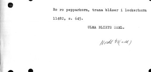 //// fl I //// tB ^r //// Ro ro pepparkorn, trana blåser i leckerhorn //// 11482, s. 645. //// ULMA BLIXTS SAML. //// /i/fJ/ ////