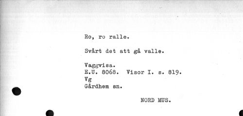 //// I ' //// « //// Ro, ro ralle. //// Svårt det att gå valle. //// Vaggvisa. //// E.U. 8068. Visor I. s. 819* //// Vg //// ^^ Gårdhem sn. //// NORD MUS. ////